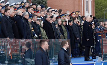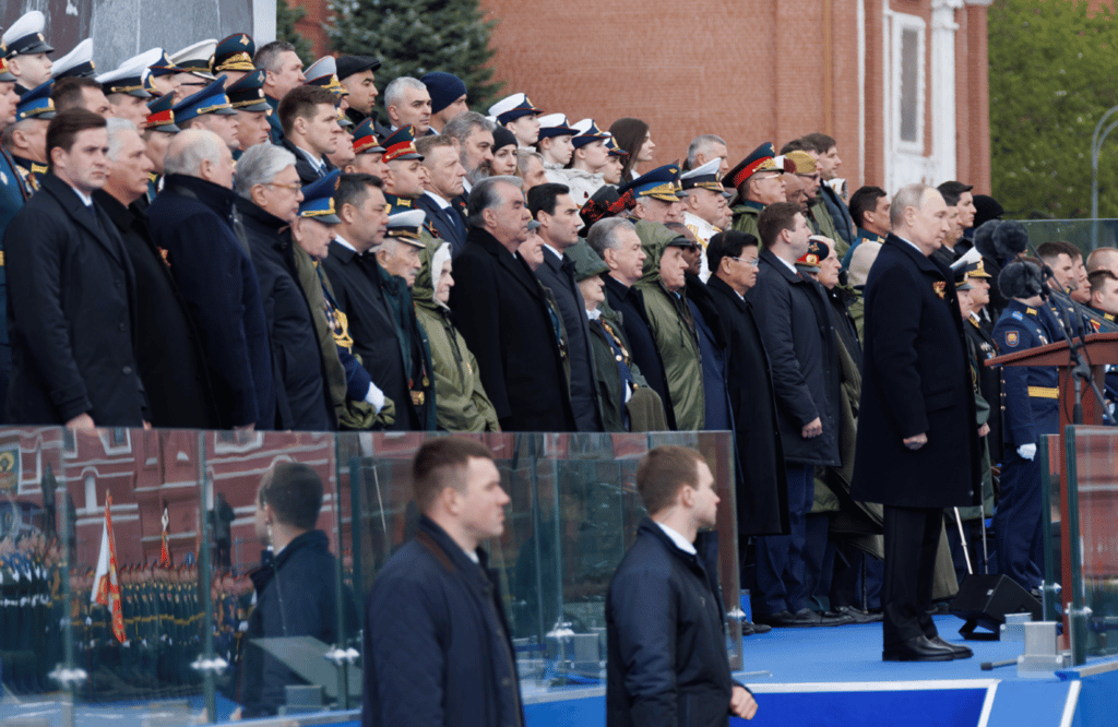 Parata del 9 maggio 2024 a Mosca, in occasione del Giorno della Vittoria. Vladimir Putin assiste alla cerimonia insieme ai vertici militari e a delegazioni straniere. La presenza di rappresentanti internazionali rafforza la narrazione della Russia come potenza sovrana e attore centrale nell’ordine globale contemporaneo.